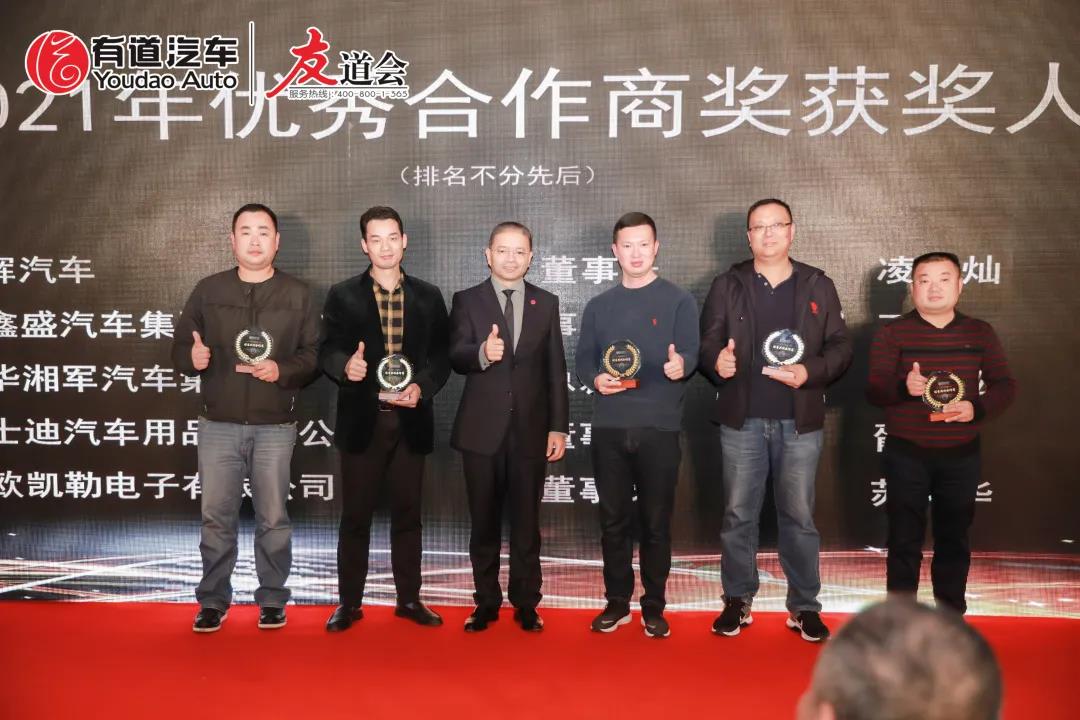 有道汽車集團林大昌林董上臺為各位優(yōu)秀合作商頒獎,與2021年優(yōu)秀合作商獎獲獎嘉賓合影留念。